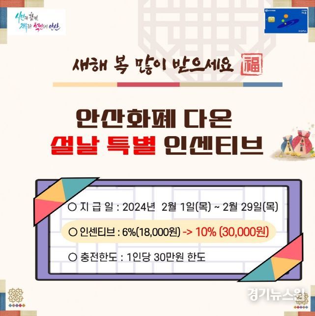 경기뉴스원 | 안산시는 민족 최대의 명절 설날을 맞아 2월 한 달 동안 안산화폐 다온 ‘특별 인센티브’를 지급한다고 29일 밝혔다.