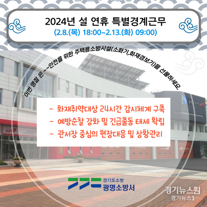 경기뉴스원(경기뉴스1) | 광명소방서(서장 박평재)는 오는 2월 8일 18시부터 13일 09시까지 6일간 설 연휴 특별 경계근무에 임한다.