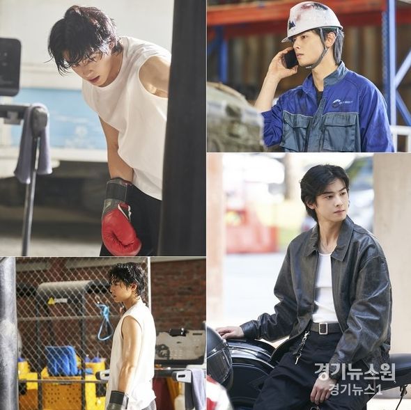 땀으로 범벅이 된 머리카락, 검을 그을음이 잔뜩 묻은 작업복, 무심하게 오토바이에 걸터앉은 모습 등, 처음 만나는 차은우의 거친 모습이 보는 이에게 신선한 매력을 선사한다.
