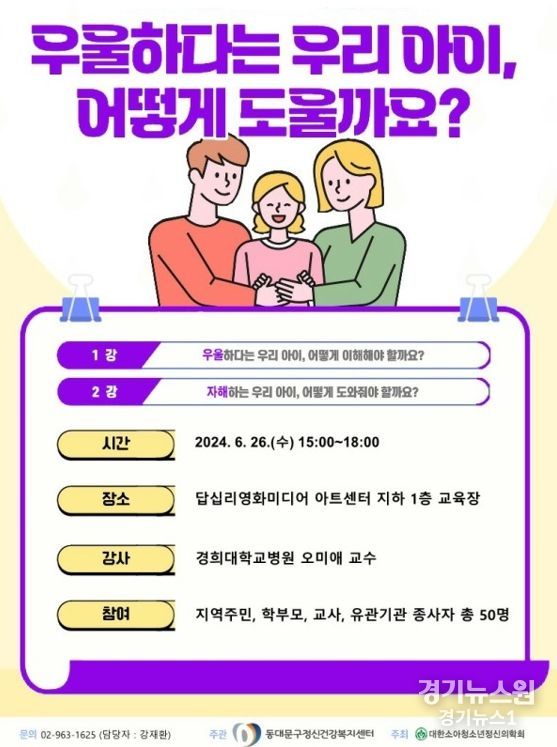 경기뉴스원(경기뉴스1) | 서울 동대문구가 6월 26일 수요일 답십리영화미디어아트센터 지하 1층 교육장에서 ‘아동 ․ 청소년 우울증에 대한 이해와 위기상황 대처법’을 주제로 공개강좌를 개최한다.