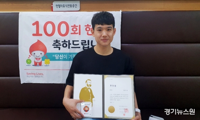 그 결과 지난 2일 야탑 헌혈의집에서 100회째 헌혈을 하고 대한적십자사로부터 헌혈 유공 명예장을 수상했다.
