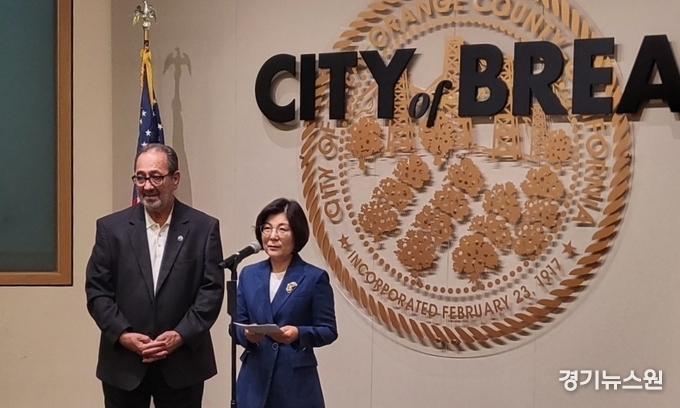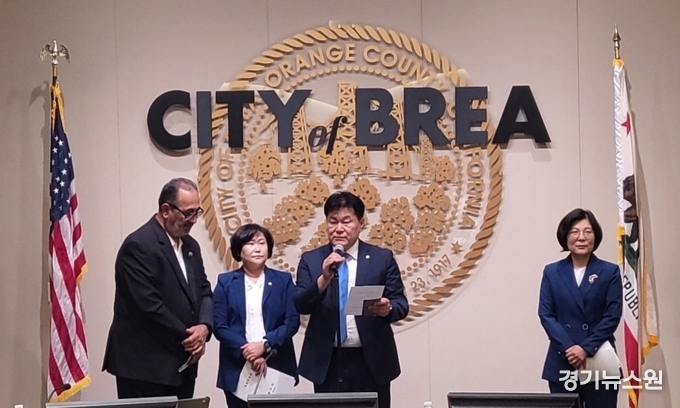 김보라 시장과 안성시의회 이중섭 운영위원장, 이관실 시의원은 지난 8월 15일 19시에 개최된 미국 브레아시 의회 정례회 초청 연설을 통해 자매도시 시민들과 공직자들에게 우정의 메시지를 전했다.