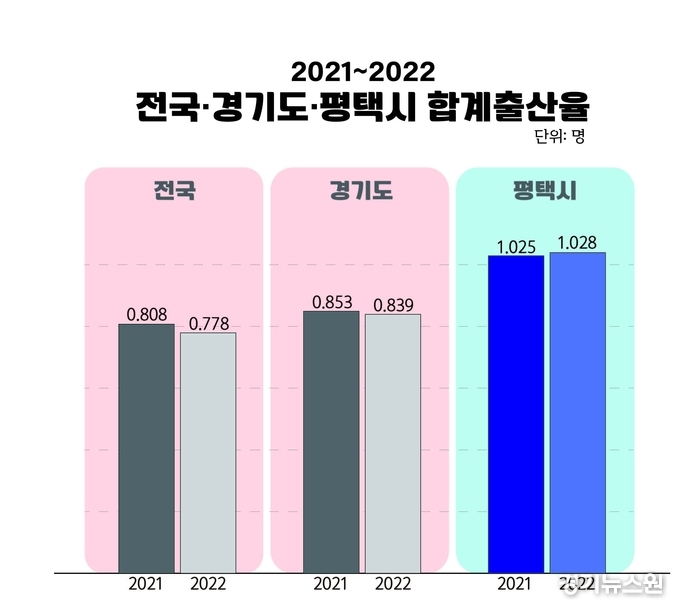 국가통계포털에 지난 12일 발표된 ‘2022년 전국 시군구 합계출산율’에 따르면 전국의 합계출산율은 전년도보다 3.7% 감소한 0.778명으로 나타났으며 경기도의 합계출산율은 전년 대비 1.6% 감소한 0.839명으로 기록됐다. 반면, 평택시의 합계출산율은 전년 대비 0.3% 증가한 1.028명을 기록했다. 전국 평균 대비 32%, 경기도 평균 대비 23% 높은 수치다.