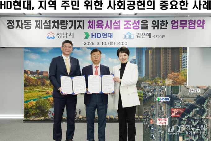 경기뉴스원(경기뉴스1) | 성남시(시장 신상진)는 10일, 분당구 정자동 제설차량기지 부지에 체육시설을 조성하기 위한 업무협약을 HD현대와 체결했다. 이번 협약을 통해, HD현대는 성남시가 제설차량기지로 사용하던 9707㎡ 규모의 시유지 부지를 주민 체육시설로 탈바꿈시키는 사업의 전액 비용을 부담한다.