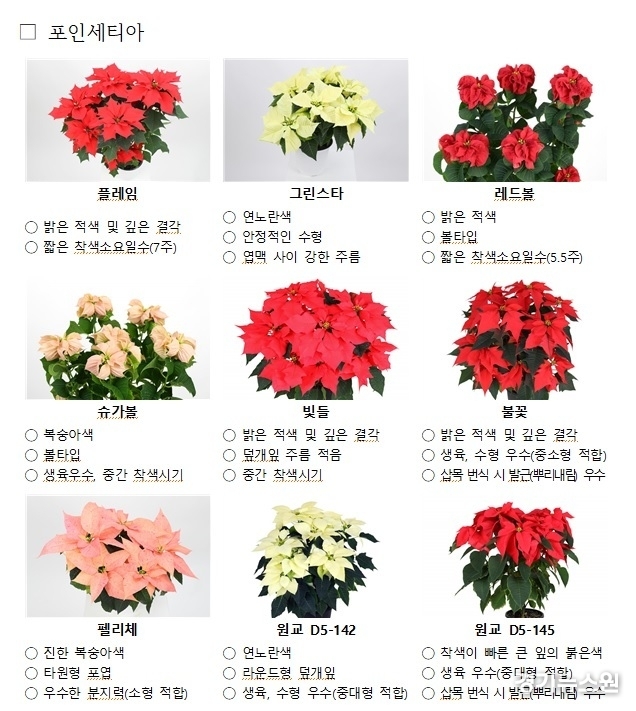 농촌진흥청 국립원예특작과학원 화훼과 이영란 과장은 “포인세티아는 국내 보급률이 매우 높은 화훼 작목으로 국산 품종에 대한 농가 요구도와 소비자 만족도가 매우 높다.”라며 “소비 경향을 반영한 품종을 개발하고 지속해서 홍보함으로써 농가 소득 증가와 소비 촉진에 기여하겠다.”라고 전했다.