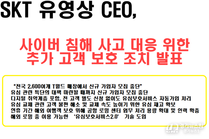 【사회=경기뉴스원/경기뉴스1】 | SK텔레콤(CEO 유영상)은 최근 사이버 침해 사고로 인한 고객 불안과 불편을 해소하기 위해 추가적인 보호 조치를 발표했다.