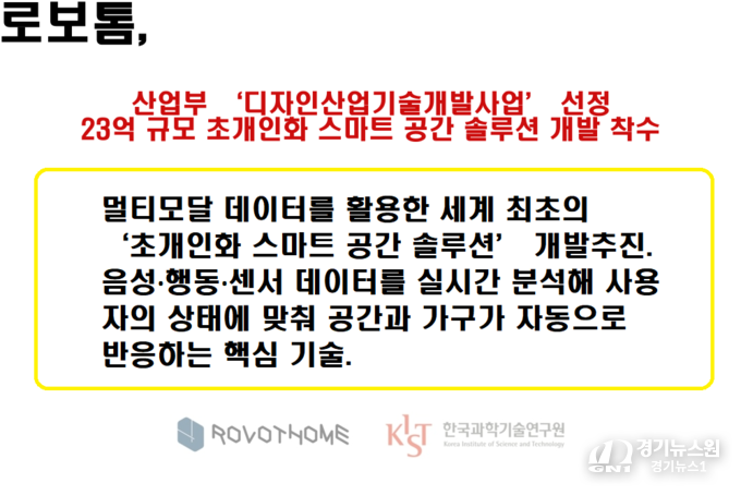 【경기뉴스원/경기뉴스1】 | AIoT 기반 로보틱스 주거 솔루션 기업 ㈜로보톰(대표 윤세용·강희진)이 산업통상자원부의 ‘디자인산업기술개발사업’에 최종 선정돼 총 23억 원 규모의 국가 R&D를 수행한다고 8일 밝혔다.