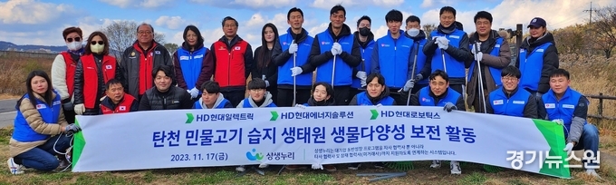 HD현대일렉트릭·HD현대에너지솔루션·HD현대로보틱스 등 3개사 임직원 20여명은 경기도 성남시에 위치한 ‘탄천 민물고기 습지 생태원’에서 자생하고 있는 국가 보호종 식물 가시연의 서식지 보전 및 생육 활성화를 위해 75리터 종량제봉투 15개 분량의 천적 관계인 환삼덩굴 등 생태계 교란 외래 식물 제거 작업을 했다.