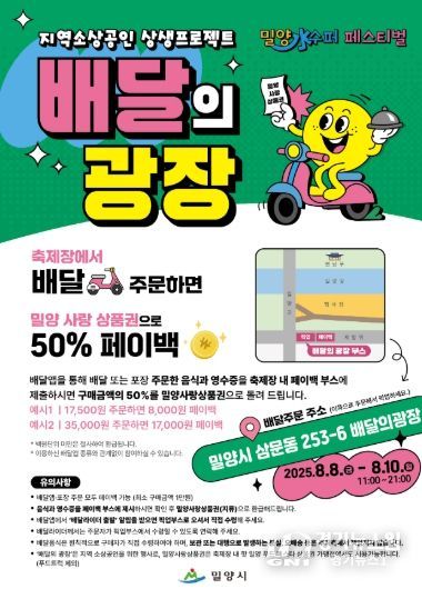 [경기뉴스원/경기뉴스1] | 밀양시는 오는 8월 8일부터 10일까지 삼문동 밀양강변 둔치에서 개최되는 ‘2025 밀양 수퍼 페스티벌’ 기간 동안 지역 소상공인과의 상생을 위한 특별 행사‘배달의 광장’을 운영한다고 29일 밝혔다.