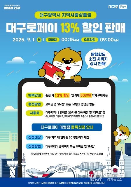 [경기뉴스원/경기뉴스1] | 대구광역시는 오는 9월 1일부터 대구사랑상품권 ‘대구로페이’의 할인율을 기존 7%에서 13%로 대폭 상향해 발행한다.