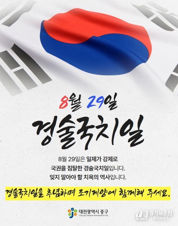 [경기뉴스원/경기뉴스1] | 대전 중구는 8월 29일 경술국치일을 맞아 ‘조기 달기 운동’을 추진 한다.