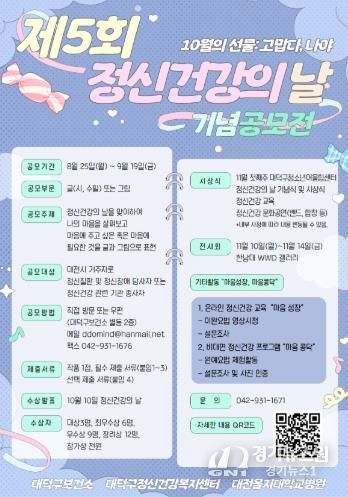 [경기뉴스원/경기뉴스1] | 대전 대덕구는 오는 10월 10일 ‘세계 정신건강의 날’을 맞아 지역 주민과 함께하는 ‘제5회 정신건강의 날 기념 공모전’을 개최한다고 1일 밝혔다.