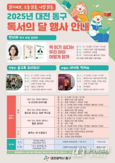 [경기뉴스원/경기뉴스1] | 대전 동구는 9월 독서의 달을 맞아 ‘읽기예보, 오늘 읽음, 내일 맑음’이라는 슬로건 아래, 구민 누구나 함께할 수 있는 다채로운 독서 문화 행사를 개최한다고 2일 밝혔다.