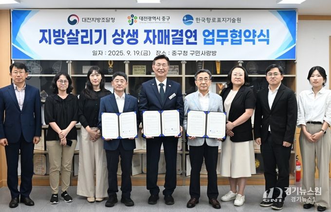 [경기뉴스원/경기뉴스1] | 대전 중구는 지난 19일 대전지방조달청, 한국항로표지기술원과 지방살리기 상생 자매결연 업무협약을 체결했다고 밝혔다.