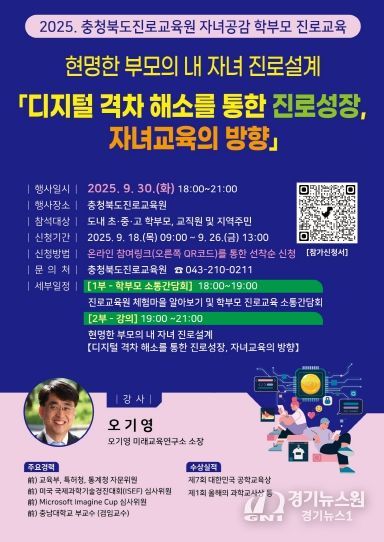 [경기뉴스원/경기뉴스1] | 충청북도교육청 직속기관 진로교육원은 오는 30일 18시에 학부모들이 변화하는 미래사회에 맞춰 자녀의 진로설계 역량을 강화할 수 있도록 2025 하반기 학부모 진로교육을 운영한다고 밝혔다.