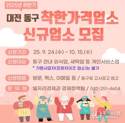 [경기뉴스원/경기뉴스1] | 대전 동구는 지역 내 물가 안정과 건전한 소비문화 확산을 위해 2025년 하반기 ‘착한가격업소’ 일제 정비와 신규 업소 모집을 실시한다고 25일 밝혔다.