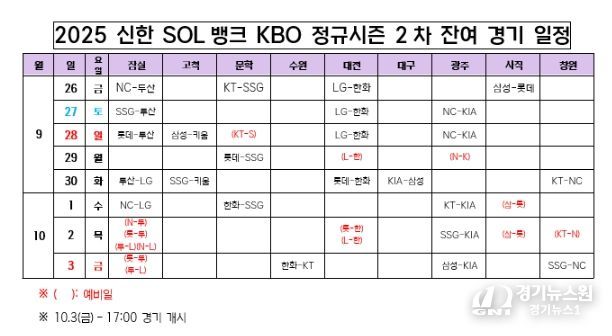[경기뉴스원/경기뉴스1] | KBO는 26일(금) 2025 신한 SOL뱅크 KBO 정규시즌 2차 잔여 경기 일정을 확정했다.