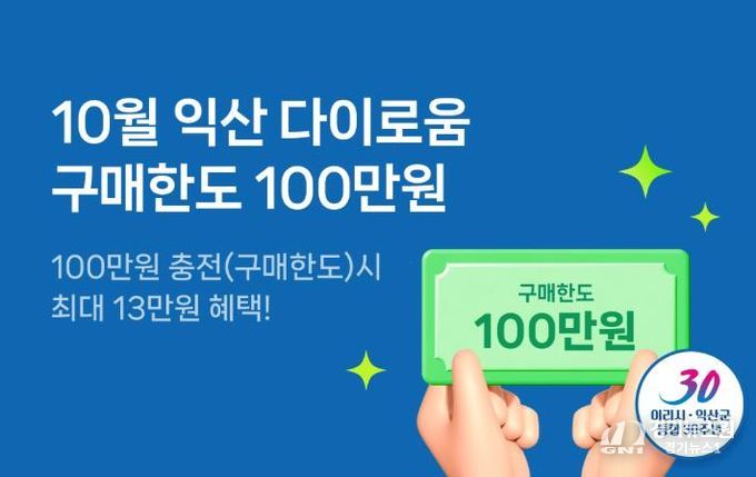 [경기뉴스원/경기뉴스1] | 익산시가 이리시·익산군 통합 30주년과 시민의 날(10월 3일)을 기념해, 10월 한 달간 지역사랑상품권 '익산 다이로움'의 개인별 구매한도를 기존 60만 원에서 100만 원으로 확대한다고 30일 밝혔다.