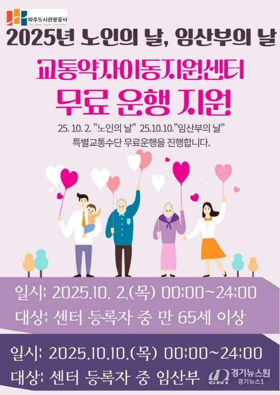[경기뉴스원/경기뉴스1] | 파주도시관광공사 교통약자이동지원센터는 10월 2일 “노인의 날”과 10월 10일 “임산부의 날”을 맞이하여 특별교통수단 무료 운행 서비스를 진행한다고 밝혔다.