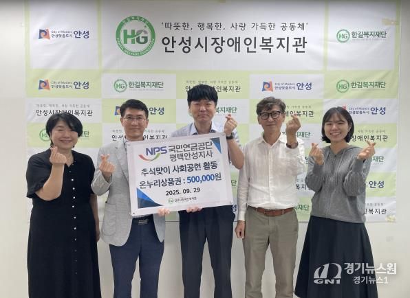 [경기뉴스원/경기뉴스1] | 사회복지법인 한길복지재단에서 수탁하고 있는 안성시장애인복지관은 지난 9월 29일 국민연금공단 평택안성지사로부터 사회공헌활동으로 50만원 상당의 온누리 상품권을 후원받았다고 밝혔다.