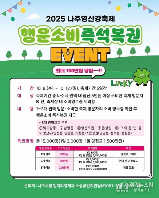 [경기뉴스원/경기뉴스1] | 전라남도 나주시가 ‘2025 나주영산강축제’를 찾는 시민과 관광객들에게 특별한 즐거움과 함께 지역 상권 활력을 불어넣기 위해 ‘행운 소비 즉석 복권 이벤트’를 진행한다.