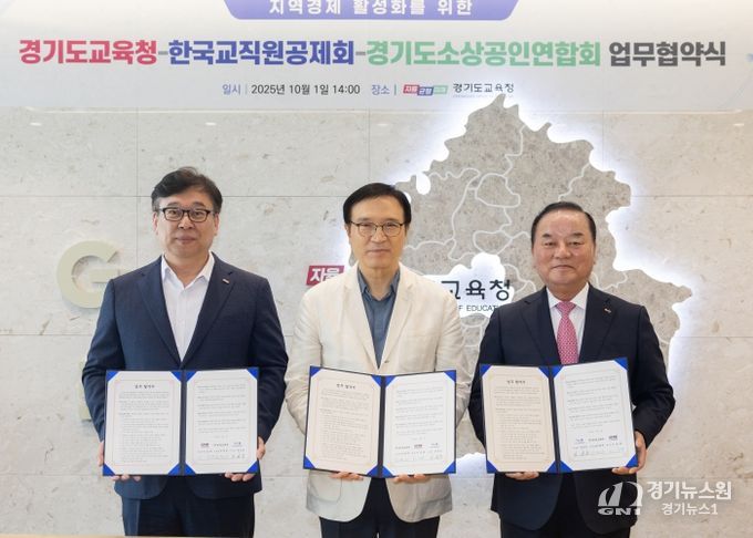 [경기뉴스원/경기뉴스1] | 경기도교육청이 1일 남부청사에서 경기도소상공인연합회, 한국교직원공제회와 ‘지역경제 활성화를 위한 상생 업무협약’을 체결했다.