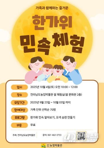 [경기뉴스원/경기뉴스1] | 전라남도 농업박물관은 다가오는 한가위를 맞아 가족 단위 관람객 대상으로 ‘한가위 민속 체험행사’를 10월 4일에 개최한다고 밝혔다.
