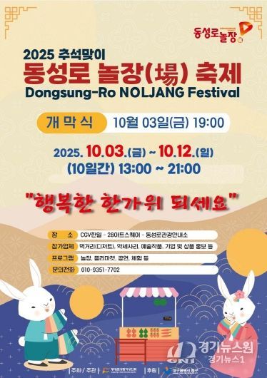[경기뉴스원/경기뉴스1] | 대구 중구는 10월 3일부터 12일까지 10일간 동성로 보행자전용도로 일원에서 ‘동성로에서 놀며 장보자!’라는 테마로 ‘2025 추석맞이 동성로 놀장(場) 축제’를 개최한다.