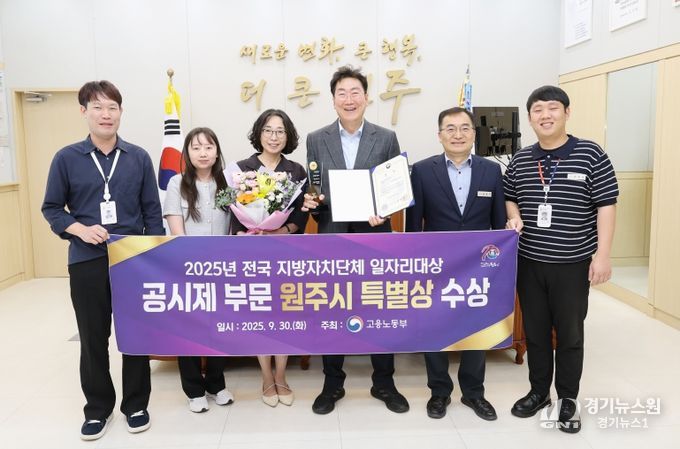 [경기뉴스원/경기뉴스1] | 원주시는 지난 30일 청주 오스코에서 열린 고용노동부 주관 ‘2025 전국 지방자치단체 일자리대상’ 공시제 부문에서 특별상을 수상했다. 지난해 우수상에 이어 2년 연속 장관상을 받으며, 일자리창출 분야에서 전국적으로 성과를 인정받았다.