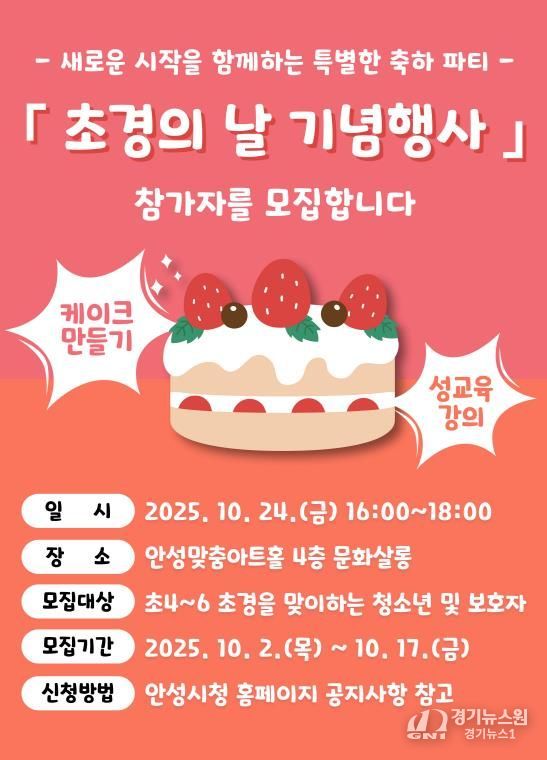 [경기뉴스원/경기뉴스1] | 안성시는 초경의 날을 맞이하여 오는 10월 24일 금요일 안성맞춤아트홀 4층 문화살롱에서 개최되는 '2025년 초경의 날 기념행사' 참여자를 오늘(2일)부터 모집한다고 밝혔다.