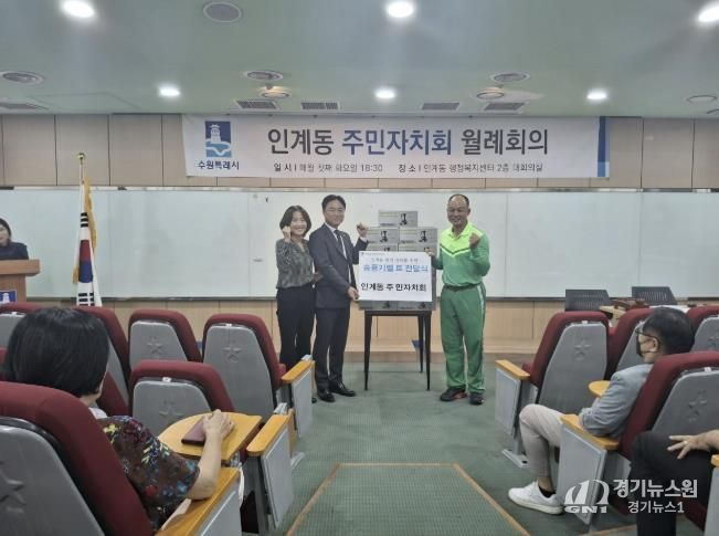 [경기뉴스원/경기뉴스1] | 수원시 팔달구 인계동 주민자치회는 지난 10월 1일, 가을철 관내 낙엽청소용 송풍기 벨트(100만 원 상당)를 인계동 행정복지센터에 전달했다.