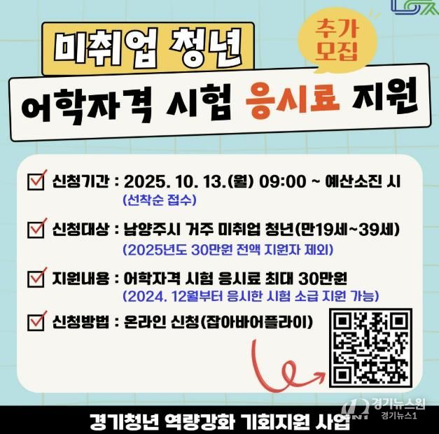 [경기뉴스원/경기뉴스1] | 남양주시는 10월 13일부터 미취업 청년을 대상으로 어학·자격 시험 응시료 지원 신청을 추가로 받는다고 2일 밝혔다.