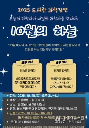 [경기뉴스원/경기뉴스1] | 고양특례시 일산도서관에서는 과학자들의 재능기부 도서관 과학 강연프로그램 ‘10월의 하늘’을 운영한다.
