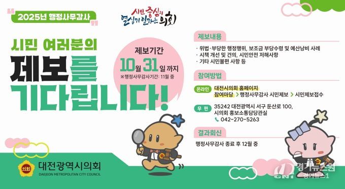 [경기뉴스원/경기뉴스1] | 대전시의회는 2025년도 행정사무감사를 앞두고 내실있는 감사를 실시하기 위해 오는 10월 31일까지 다양한 시민 제보를 받는다.