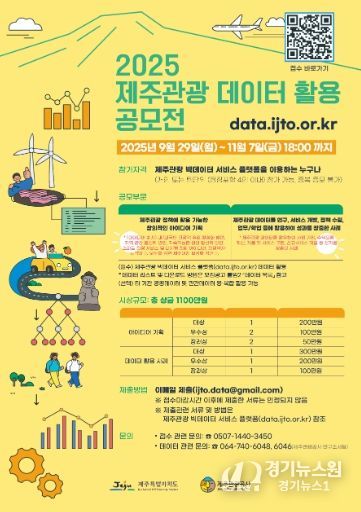 [경기뉴스원/경기뉴스1] | 제주특별자치도와 제주관광공사는 오는 11월 7일까지 온라인 채널을 통해 ‘2025년 제주관광 데이터 활용 공모전’ 참가자를 모집하고 있다고 2일 밝혔다.