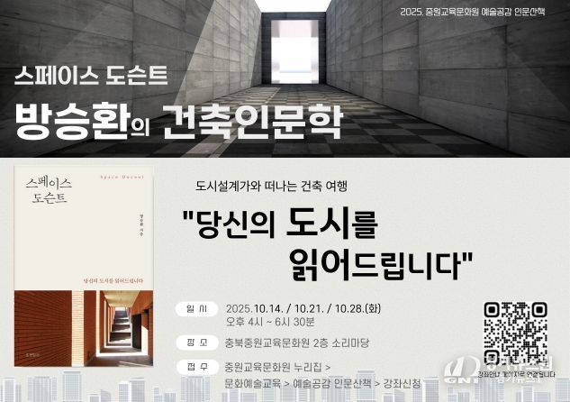 [경기뉴스원/경기뉴스1] | 충청북도교육청 직속기관 중원교육문화원(원장 배상근)은 교육공동체 구성원들의 인문적 소양과 예술적 감수성을 높이기 위해 운영중인 문화교육 프로그램 '예술공감 인문산책'의 10월 강연 수강생을 선착순 모집한다고 전했다.