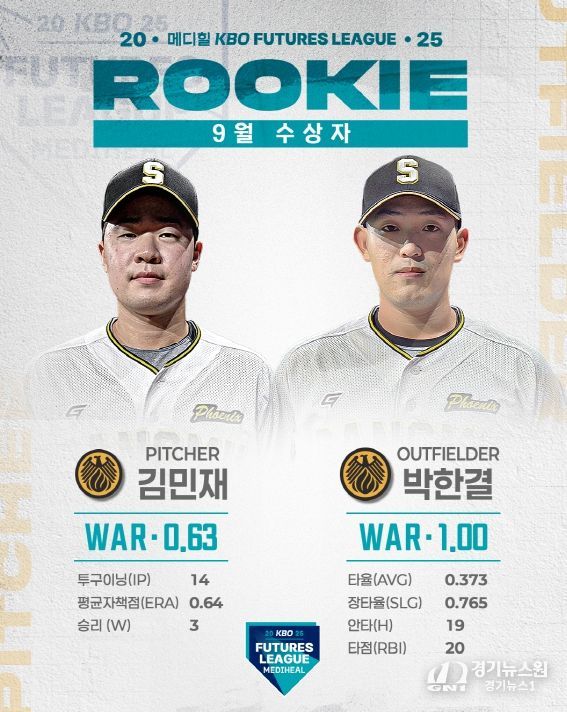 [경기뉴스원/경기뉴스1] | 2025 메디힐 KBO 퓨처스리그의 9월 퓨처스 루키상 수상자로 투수 부문에는 상무 김민재가 WAR 0.63, 타자 부문에는 상무 박한결이 WAR 1.00을 기록하며 각각 선정됐다.