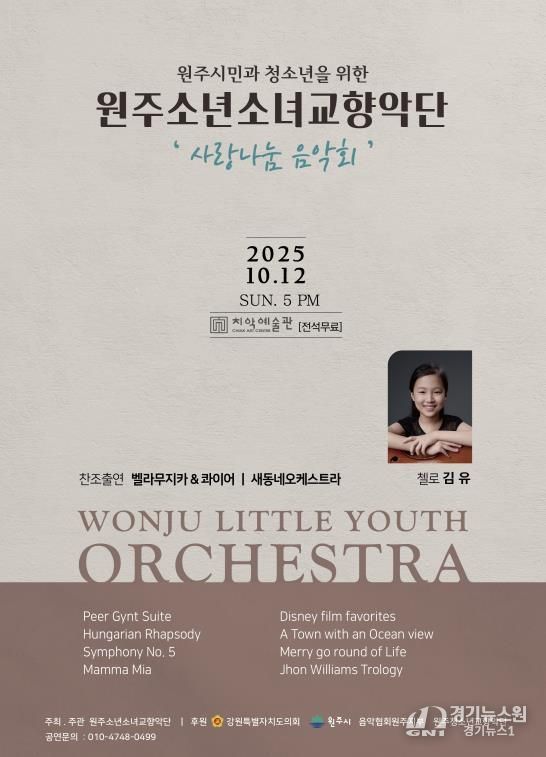 [경기뉴스원/경기뉴스1] | 원주소년소녀교향악단은 오는 12일 오후 5시, 치악예술관에서 ‘사랑나눔음악회’를 통해 지역사회와 함께하는 따뜻한 무대를 마련한다.
