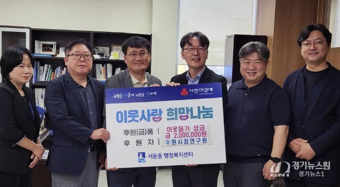 [경기뉴스원/경기뉴스1] | 수원시정연구원과 수원시정연구원 사우회가 지난 10월 2일, 추석을 맞아 나눔을 실천하고자 성금 200만원을 서둔동 행정복지센터에 기탁했다. 이번 기탁금은 수원시정연구원장과 수원시정연구원 사우회에서 각 100만원을 모아 마련한 것이다.