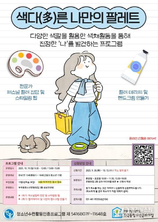 [경기뉴스원/경기뉴스1] | 의왕시청소년재단 산하 부곡동청소년문화의집은 청소년들이 다양한 색채 활동을 통해 자신을 이해하고 개성을 발견할 수 있도록 ‘청소년수련활동인증’ 프로그램 '색다(多)른 나만의 팔레트'를 운영한다고 밝혔다.