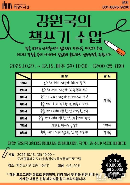 [경기뉴스원/경기뉴스1] | 고양특례시는 10월 27일부터 12월 15일까지 매주 월요일 오전 10시 30분부터 12시까지, 화정도서관 2층 나눔터1에서 ‘강원국의 책쓰기 수업’프로그램을 운영한다고 밝혔다.