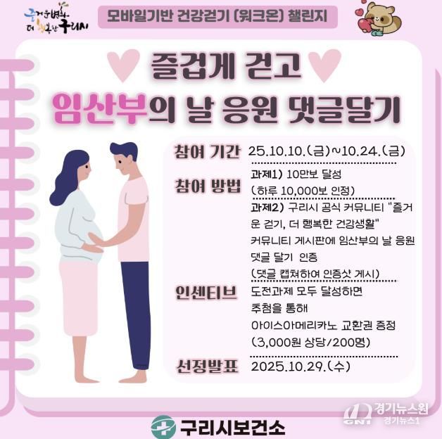 [경기뉴스원/경기뉴스1] | 구리시는 제20회‘임산부의 날’(10월 10일)을 기념해 임신과 출산의 가치를 되새기고 시민 건강 증진을 도모하기 위한 ‘즐겁게 걷고, 임산부의 날 응원 댓글 달기’ 챌린지를 오는 10월 10일부터 24일까지 15일간 운영한다고 밝혔다.