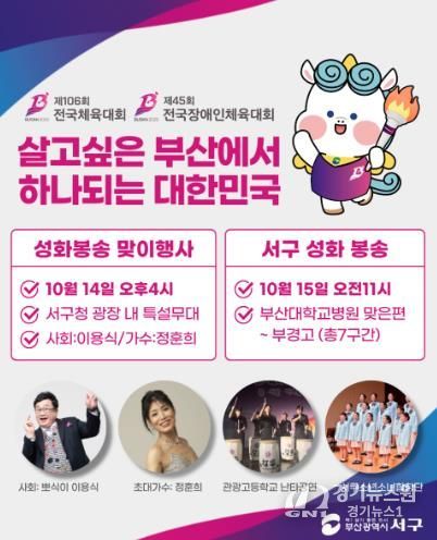 [경기뉴스원/경기뉴스1] | 부산 서구는 오는 10월 14일 16시, 제106회 전국체육대회와 제45회 전국장애인체육대회의 시작을 알리는 “성화의 불꽃, 하나되는 서구”를 주제로 성화봉송 맞이행사를 서구청 광장 특설무대에서 개최한다고 밝혔다.