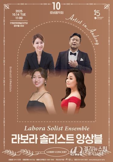 [경기뉴스원/경기뉴스1] | 안동문화예술의전당은 지역예술인들에게 다양한 무대 경험을 제공하고, 시민에게는 일상 속 음악 향유의 기회를 선사하기 위해 매월 첫째 주 화요일 오전 11시 로비음악회 시리즈를 진행하고 있다. 오는 10월 14일 오전 11시, '라보라 솔리스트 앙상블'이 안동문화예술의전당 웅부홀 로비에서 열린다.