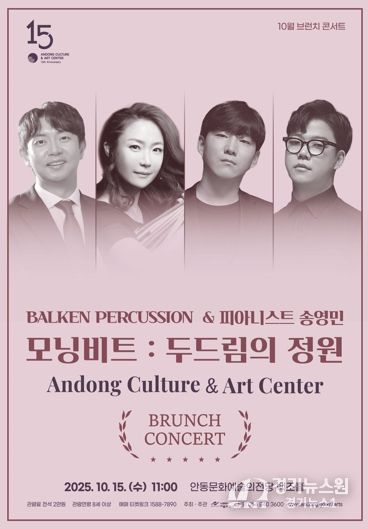 [경기뉴스원/경기뉴스1] | 안동문화예술의전당은 매월 둘째 주 수요일, 클래식 애호가들을 위한 감성 콘서트 시리즈인 ‘브런치 콘서트’를 꾸준히 선보이며 지역 문화 활성화에 앞장서고 있다. 10월의 브런치 콘서트, '모닝비트: 두드림'이 오는 10월 15일 오전 11시, 안동문화예술의전당 백조홀에서 열린다.