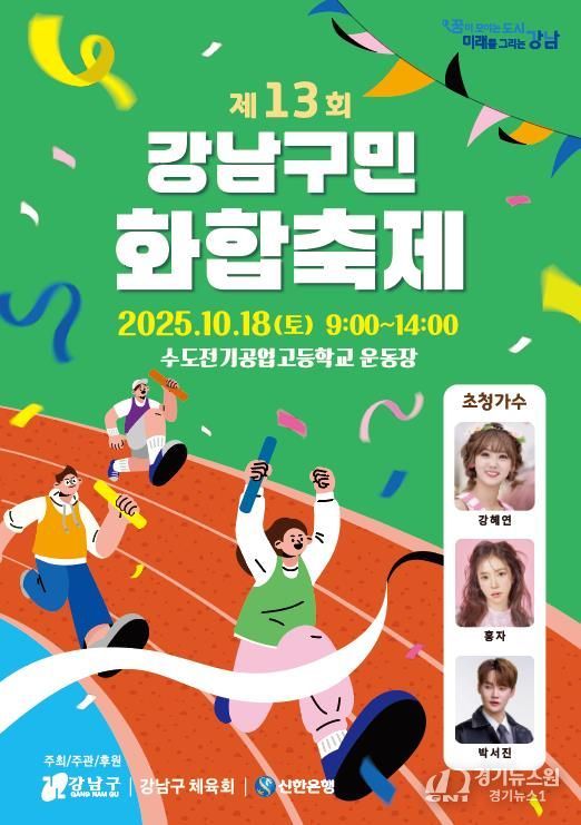 [경기뉴스원/경기뉴스1] | 꿈이 모이는 도시, 미래를 그리는 강남구가 오는 10월 18일 오전 9시부터 오후 2시까지 수도전기공업고등학교 운동장에서 ‘제13회 강남구민화합축제’를 개최한다. 구민과 선수단 등 약 7,500명이 참여할 예정이며, 소통과 화합을 바탕으로 건강한 지역사회를 만드는 의미 있는 자리가 될 것으로 기대된다.