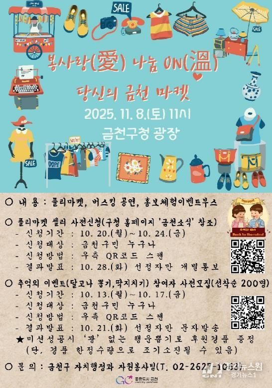 [경기뉴스원/경기뉴스1] | 금천구는 오는 11월 8일 금천구청 광장 앞에서 ‘봉사랑(愛) 나눔ON(溫), 당신의 금천마켓’을 연다고 밝혔다.