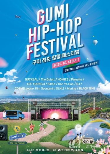 [경기뉴스원/경기뉴스1] | 구미시는 오는 10월 18일 동락공원에서 청춘들의 열정과 힙합 음악이 어우러지는 '2025 구미청춘힙합페스티벌'을 개최한다. 이번 공연은 오후 3시 30분부터 밤 10시까지 진행되며, 전석 무료(스탠딩존)로 선착순 입장할 수 있다.