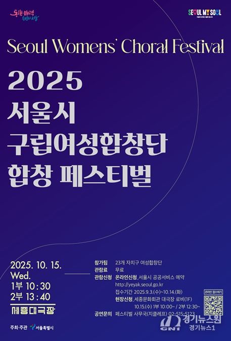 [경기뉴스원/경기뉴스1] | 서울시는 깊어가는 가을을 맞아 오는 10월 15일 오전 10시 30분부터 세종문화회관 대극장에서 '2025 서울시 구립여성합창단 합창 페스티벌'을 개최한다. 이번 페스티벌에는 서울시 23개 자치구 여성합창단 700여 명이 무대에 올라, 아름다운 화음으로 시민들에게 잊지 못할 감동과 따뜻한 추억을 선사할 예정이다.