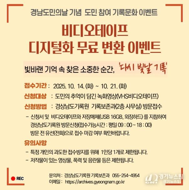 [경기뉴스원/경기뉴스1] | 경상남도기록원은 10월 14일부터 31일까지 도민이 소중한 추억을 오래도록 보존할 수 있도록 '빛바랜 기록 속 찾은 소중한 순간 – 다시 빛날 기록'이라는 주제로 비디오테이프 디지털 변환 이벤트를 추진한다고 밝혔다.
